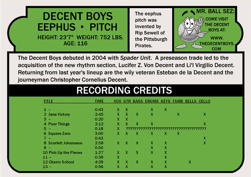![]() | ![]() | Eephus pitch EP Self-Released 2005 1. - 2. Jane Victory 3. - 4. Poor Things 5. - 6. Square Zero 7. - 8. Scarlett Johansson 9. - 10. Pick Up The Pieces 11. - 12. Charm School 13. - |
