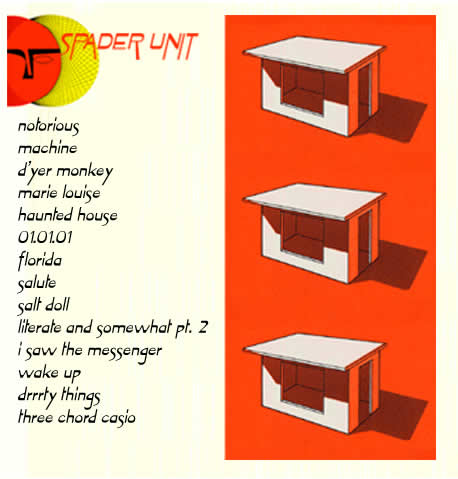 ![]() | ![]() | Spader Unit LP Self-Released 2004 1. Notorious 2. Machine 3. D'yer Monkey 4. Marie Louis 5. Haunted House 6. 01.01.01 7. Florida 8. Salute 9. Salt Doll 10. Literate and Somewhat pt. 2 11. I Saw the Messenger 12. Wake Up 13. Drrrty Things 14. Three Chord Casio |